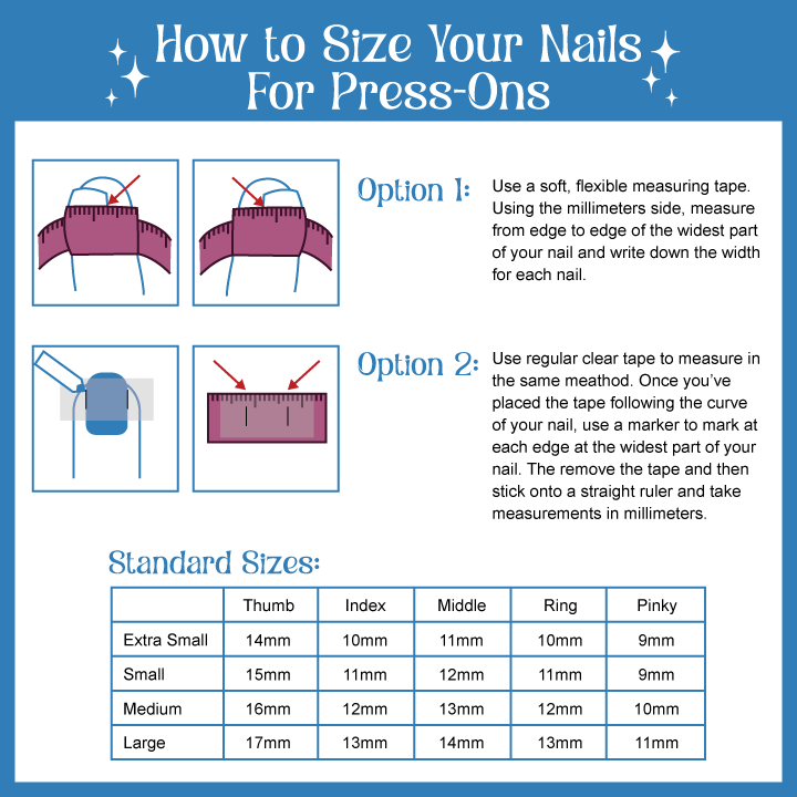 To ensure a perfect fit, please size your nails using one of the two methods shown here! The standard sizes are just general sizes that fit majority of people, but to get a custom fit to YOUR fingers, please feel free to select the custom option when choosing your size and list your nail sizes and I will pick nails to fit specifically to your size!